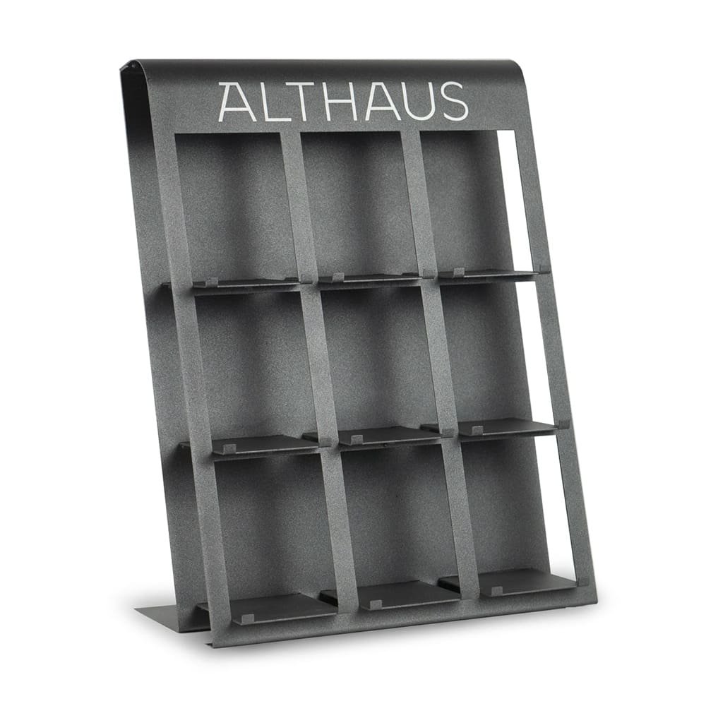 Das Althaus Metalldisplay wurde speziell für den professionellen Einsatz in Coffeeshops, Bäckereien und im Einzelhandel entwickelt. Es präsentiert neun Teesorten übersichtlich und griffbereit, betont die Premium‑Qualität der Produkte und unterstützt die Markenbotschaft.
