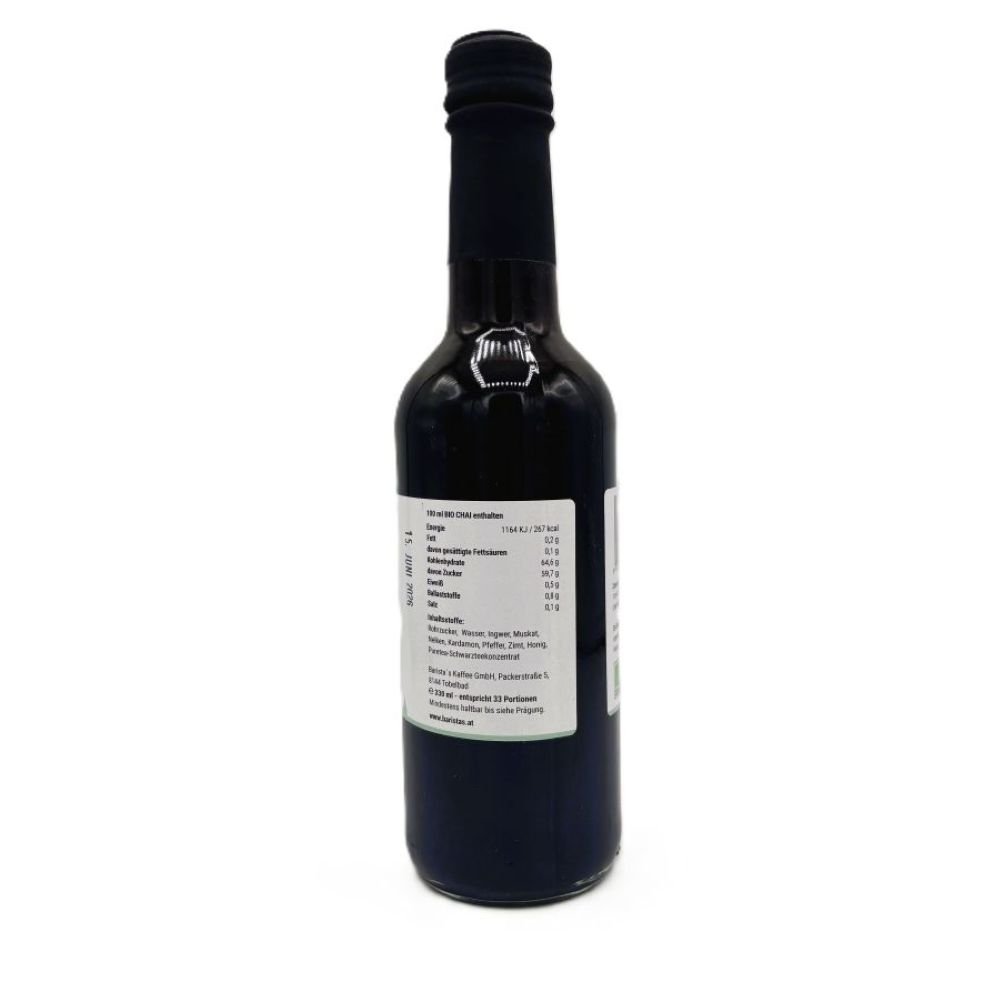 Zutaten: Bio-Rohrohrzucker, Wasser, Bio-Ingwer, Bio-Muskat, Bio-Nelken, Bio-Kardamon, Bio-Pfeffer, Bio-Zimt, Bio-Honig, Bio-Schwarzteekonzentrat