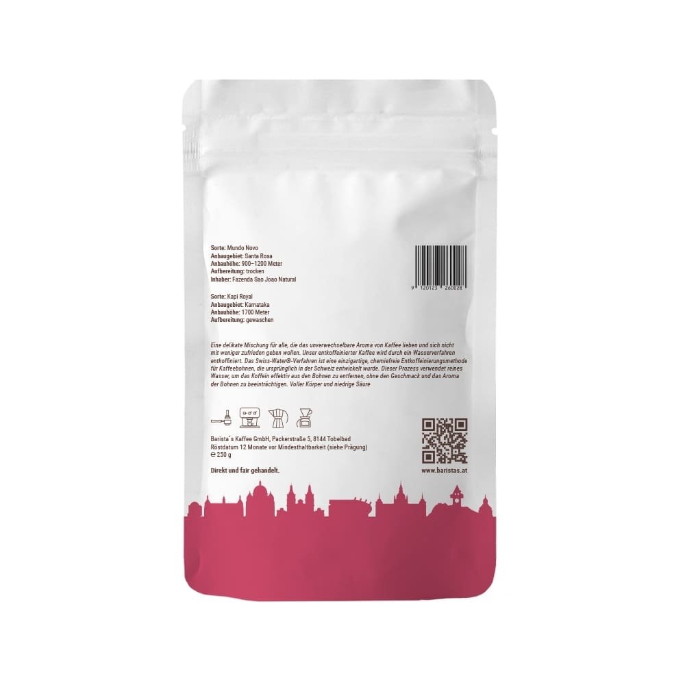 Dieser koffeinfreie Kaffee vereint sorgfältig ausgewählte Arabica- und Robusta-Bohnen zu einer harmonischen Mischung, die auch ohne Koffein durch Tiefe, Körper und Aromavielfalt überzeugt. Durch das Swiss-Water®-Entkoffeinierungsverfahren ein chemiefreie Entkoffeinierungsmethode für Kaffeebohnen, bleiben die natürlichen Geschmacksstoffe weitgehend erhalten, während das Koffein behutsam entfernt wird.