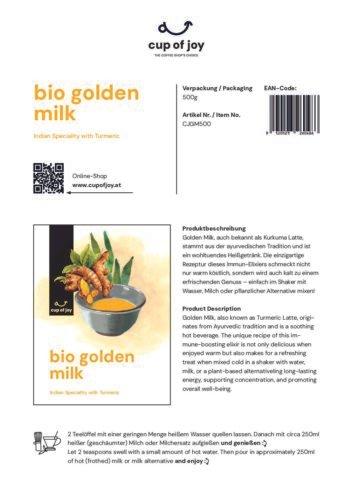 Die Cup of Joy Bio Goldenmilk ist eine traditionelle Kurkuma‑Latte neu interpretiert: eine ausgewogene Mischung aus Kurkuma, Ingwer, Pfeffer und wärmenden Gewürzen, ergänzt durch natürliche Süßungsmittel und Kokoskomponenten für eine samtige Textur. Die Rezeptur setzt auf biozertifizierte Zutaten und eine Gewürzbalance, die sowohl den charakteristischen Kurkuma‑Geschmack als auch eine angenehme Trinkbarkeit sicherstellt. Als Heißgetränk oder kalter Shake bietet Goldenmilk ein wohltuendes, aromatisches Erlebnis, das sich als tägliches Wohlfühlritual etabliert.