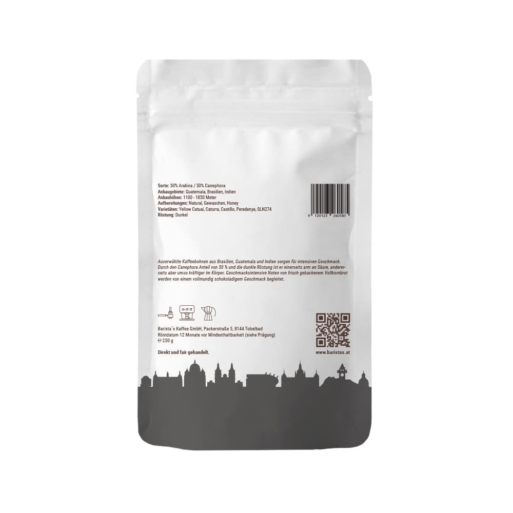 50/50% Arabica-Canephora Mischung, ganze Bohne · Intensität: 5/5