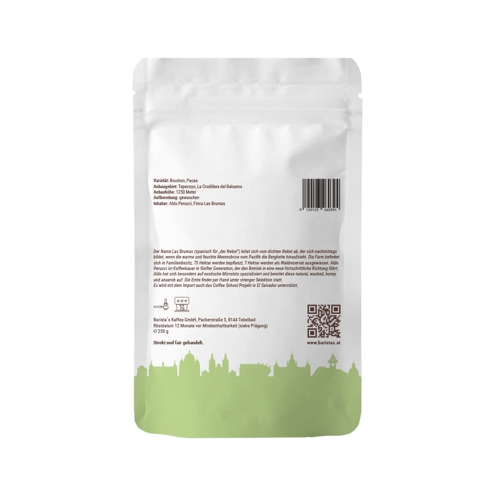 Der Name Las Brumas (spanisch für „der Nebel“) leitet sich vom dichten Nebel ab, der sich nachmittags bildet, wenn die warme und feuchte Meeresbrise vom Pazifik die Bergkette hinaufzieht. Die Farm befindet sich in Familienbesitz, 73 Hektar werden bepflanzt, 7 Hektar werden als Waldreservat ausgewiesen. Aldo Perucci ist Kaffeebauer in fünfter Generation, der den Betrieb in eine neue fortschrittliche Richtung führt. Aldo hat sich besonders auf exotische Microlots spezialisiert und bereitet diese natural, washed, honey und anaerob auf. Die Ernte findet per Hand unter strenger Selektion statt.