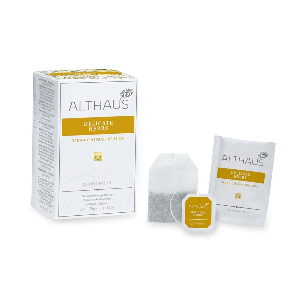 Der Althaus Delicate Herbs ist eine naturbelassene Bio-Kräuterteemischung besticht durch ihre leichte Fenchelnote, die hervorragend mit Pfefferminze und anderen klassischen Teekräutern harmoniert.