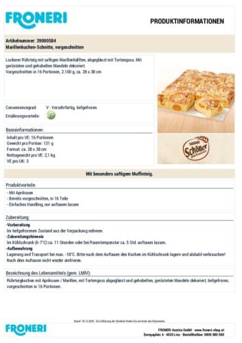 Zutaten: Aprikosen / Marillen (27%), WEIZENMEHL, Zucker, VOLLEI, Wasser, Rapsöl, Glukose-Fruktose-Sirup, MANDELN (2%),