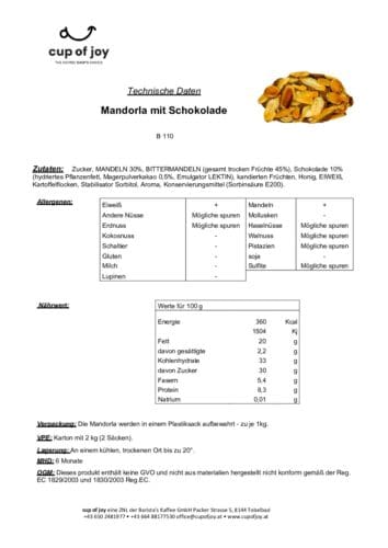 • Hauptzutaten: Zucker, Mandeln 30 %, Bittermandeln, Schokolade 10 %