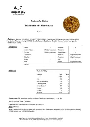 • Hauptzutaten: Zucker, Mandeln 10 %, Bittermandeln, Haselnüsse 15 %